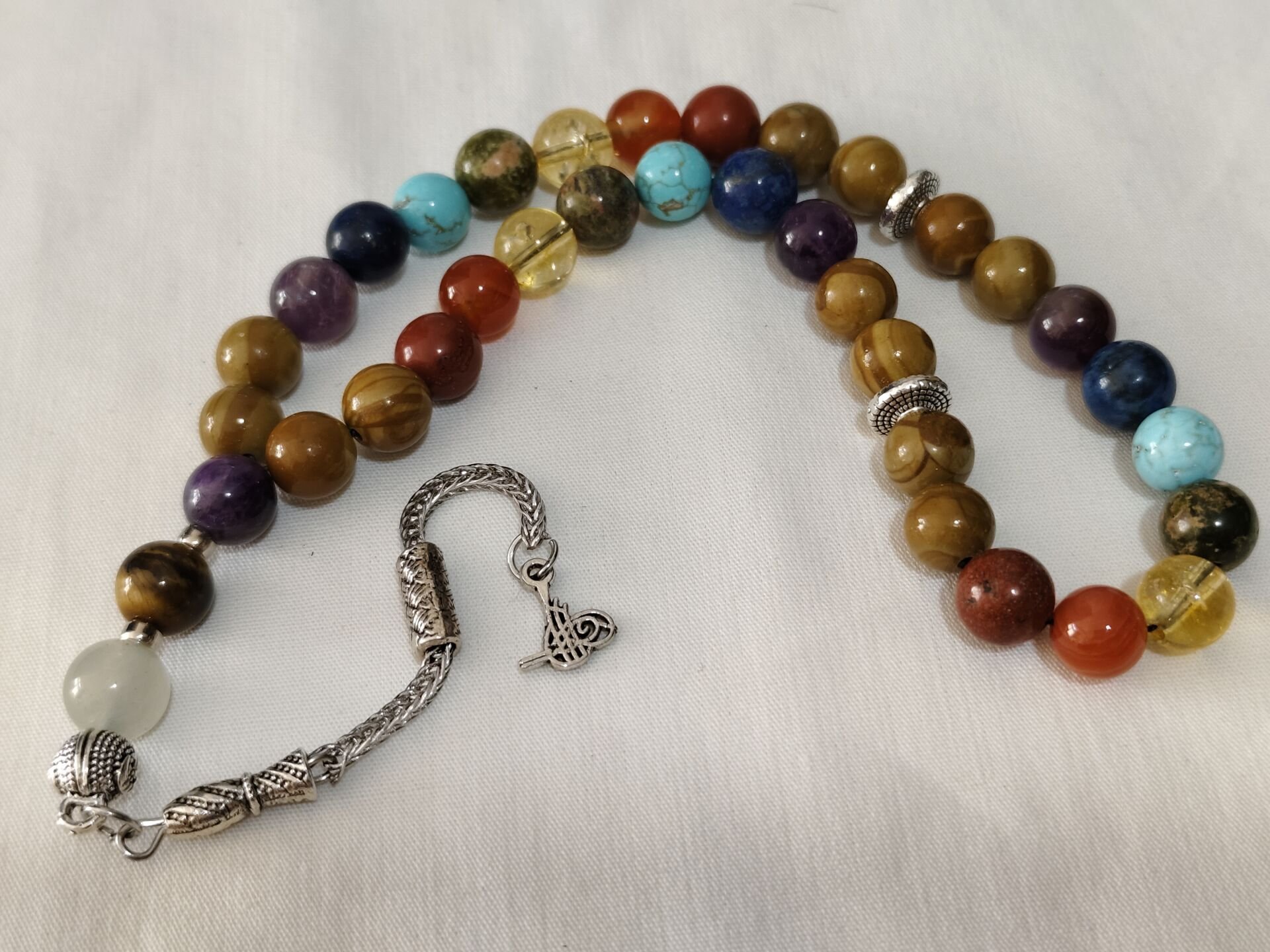 7 Çakra Doğal Taşlı 33’lük Tesbih – Enerji Dengeleyici ve El Yapımı Özel Tasarım Doğal taşların kadim enerjisiyle hazırlanan 7 Çakra uyumlu 33’lük tesbih, beden–zihin–ruh dengesini desteklemek amacıyla özenle tasarlanmıştır. Bu özel tesbihte, her biri farklı bir enerji merkezini temsil eden doğal çakra taşları ve aralarda dengeleyici özelliğiyle bilinen ağaç jasper taşı kullanılmıştır. Tesbihte yer alan taşlar, çakra sistemine uygun sırayla dizilmiş olup hem zikir ve meditasyon hem de enerji çalışmaları için idealdir. El işçiliğiyle hazırlanan bu 33’lük doğal taş tesbih, estetik görünümü ve anlamlı yapısıyla dikkat çeker. Kullanılan Taşlar ve Çakra Uyumu