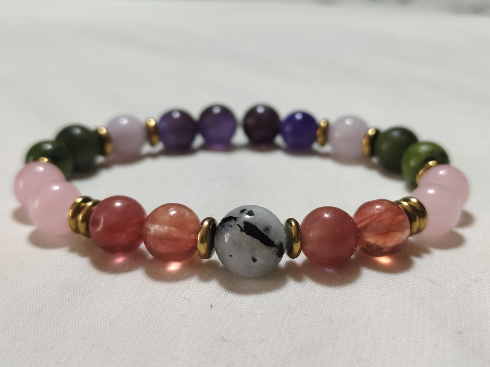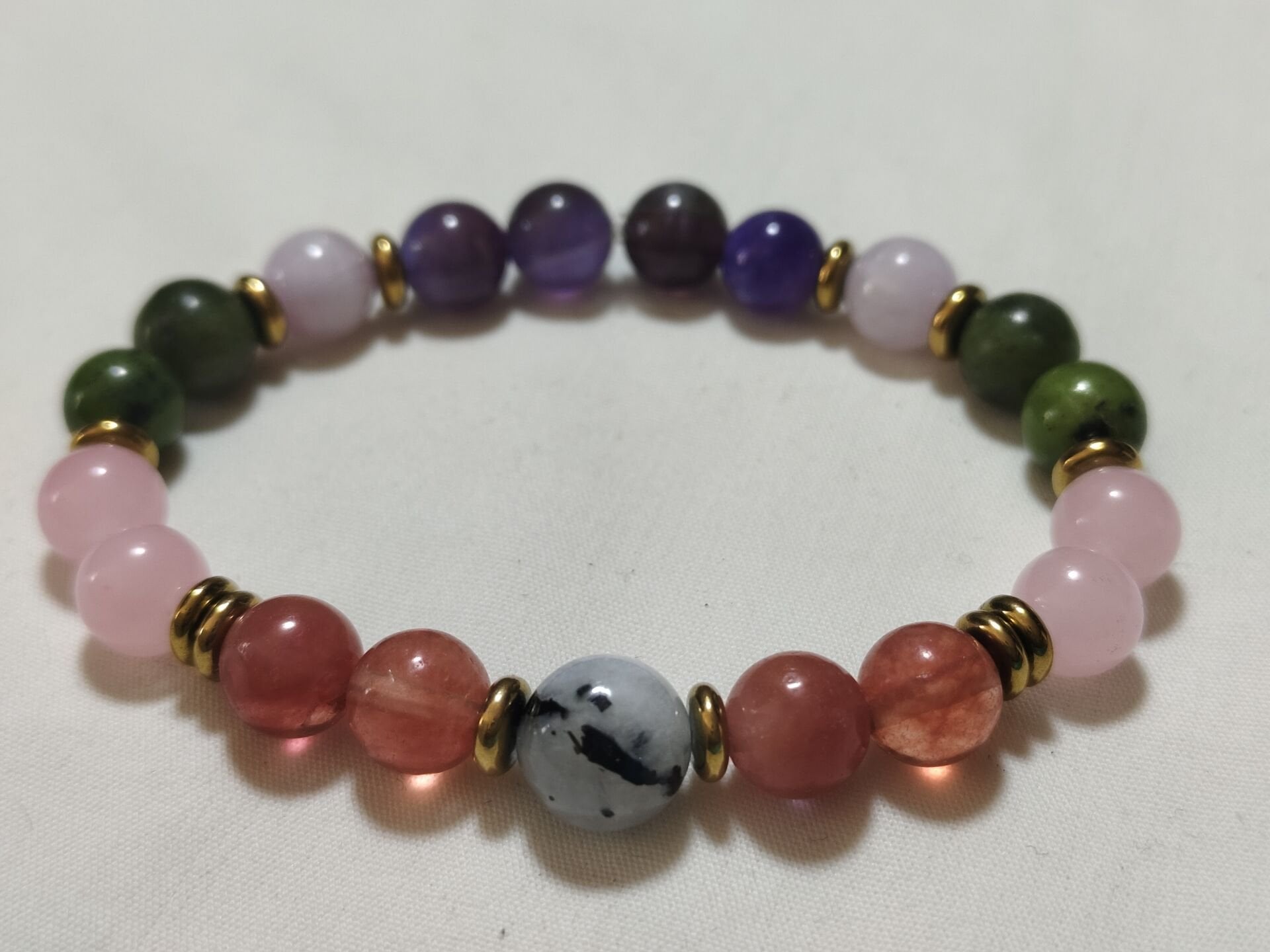 Ruhsal Denge ve Kalpten Kalbe Bağlantı Sevginin, huzurun ve ruhsal uyumun enerjisini bir arada taşıyan bu özel Aşk ve Sevgi Bilekliği, ay taşı, pembe kuvars, ametist, yeşim ve gül kuvars gibi güçlü doğal taşlardan özenle hazırlanmıştır.