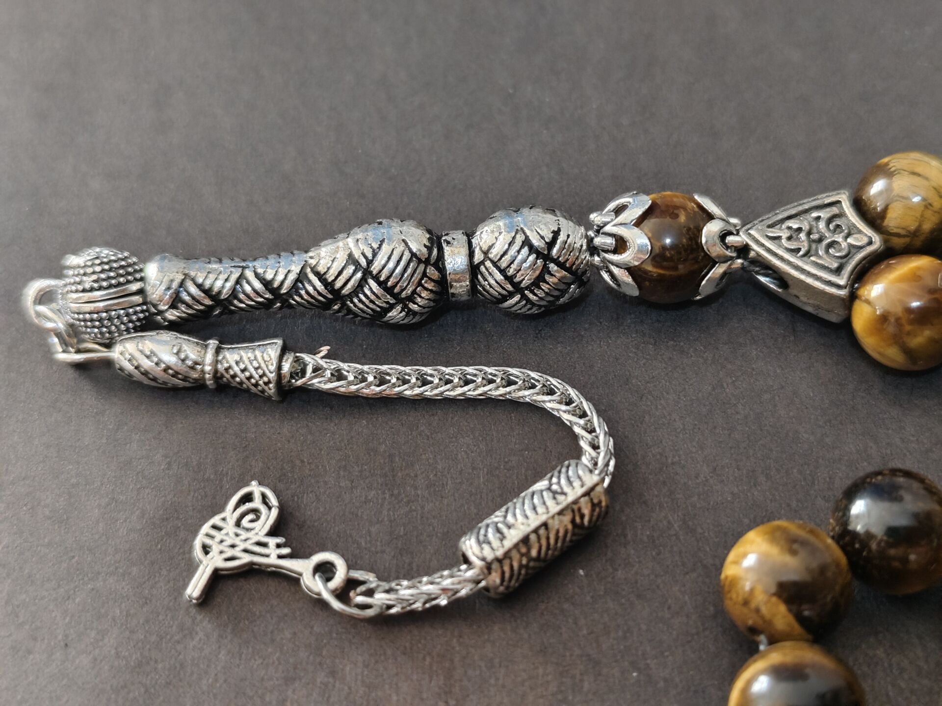 Bu tesbihte kullanılan doğal kaplan gözü taşları 8 mm boyutlarındadır. Diğer metal aparatlar zamak döküm gümüş kaplamadır. Zamanla gümüş gibi kararma yapabilir.