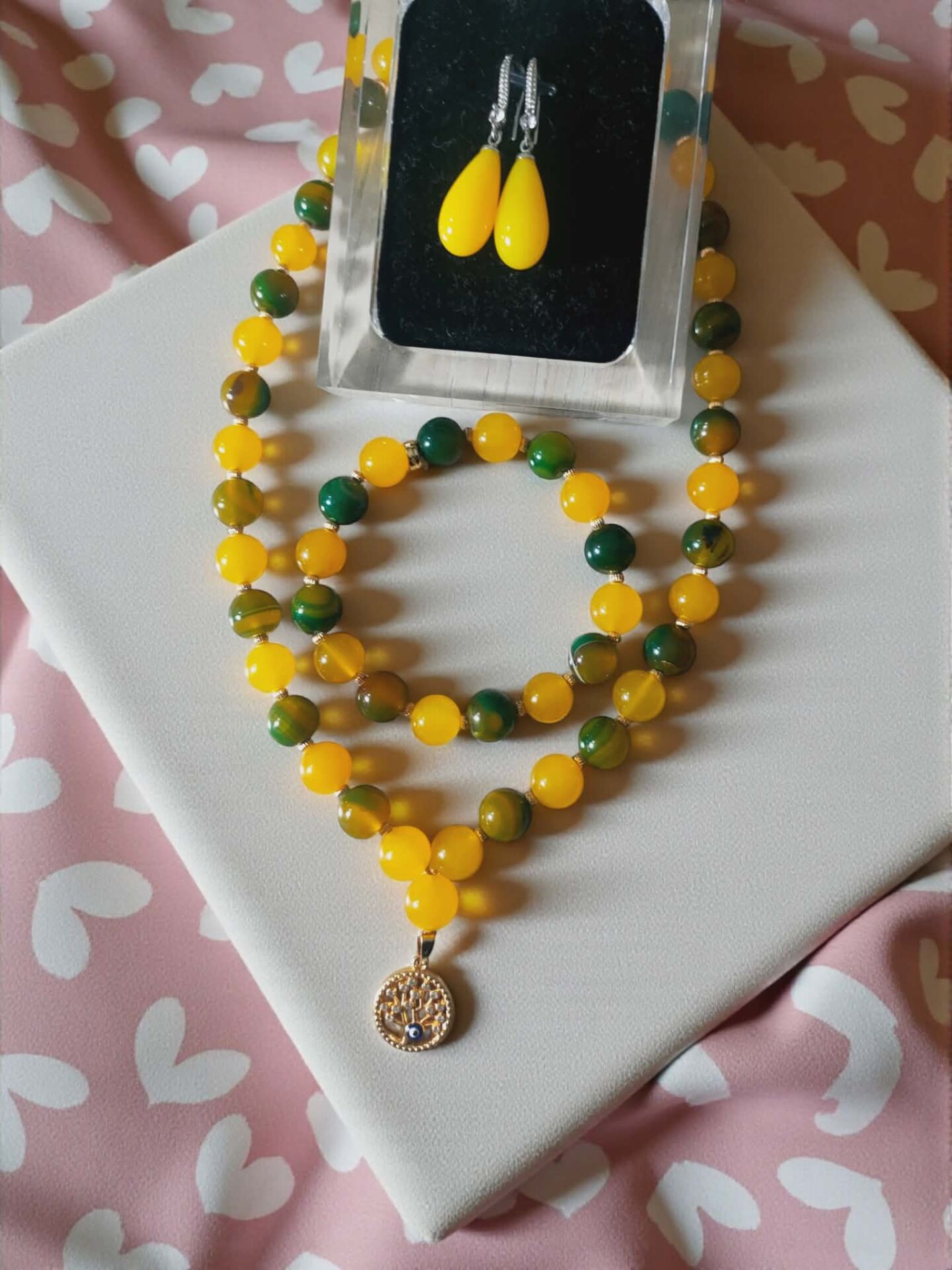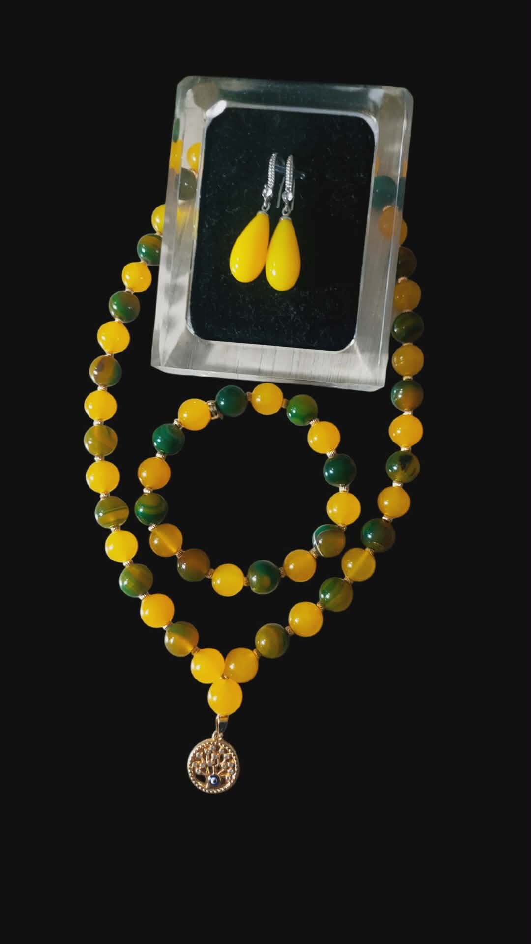 kolye sarı yeşil 10. mm boyutlarında akik taşlarından oluşan kordon ucunda paslanmaz kararmaz metal yaşam ağacı figürü
