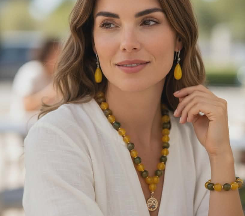 DOĞAL KEHRİBAR KÜPELER VE SARI YEŞİL DOĞAL AKİK TAŞLARI İLE 3 PARÇA ZERAFET SETİ