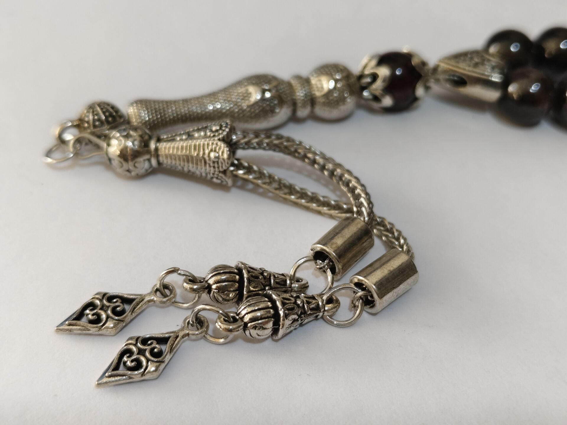 Bu tesbihte kullanılan doğal garnet taşları 8 mm boyutlarındadır. Diğer metal aparatlar zamak döküm gümüş kaplamadır. Zamanla gümüş gibi kararma yapabilir.