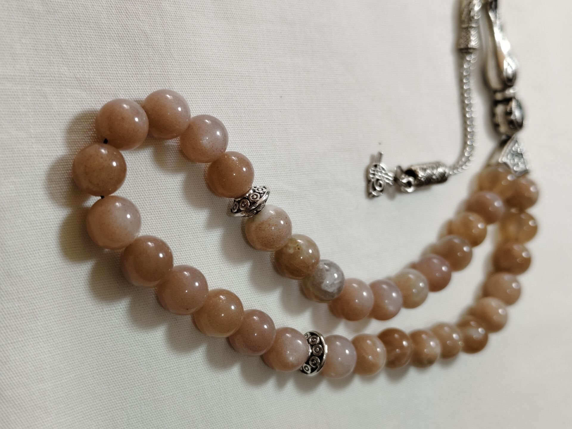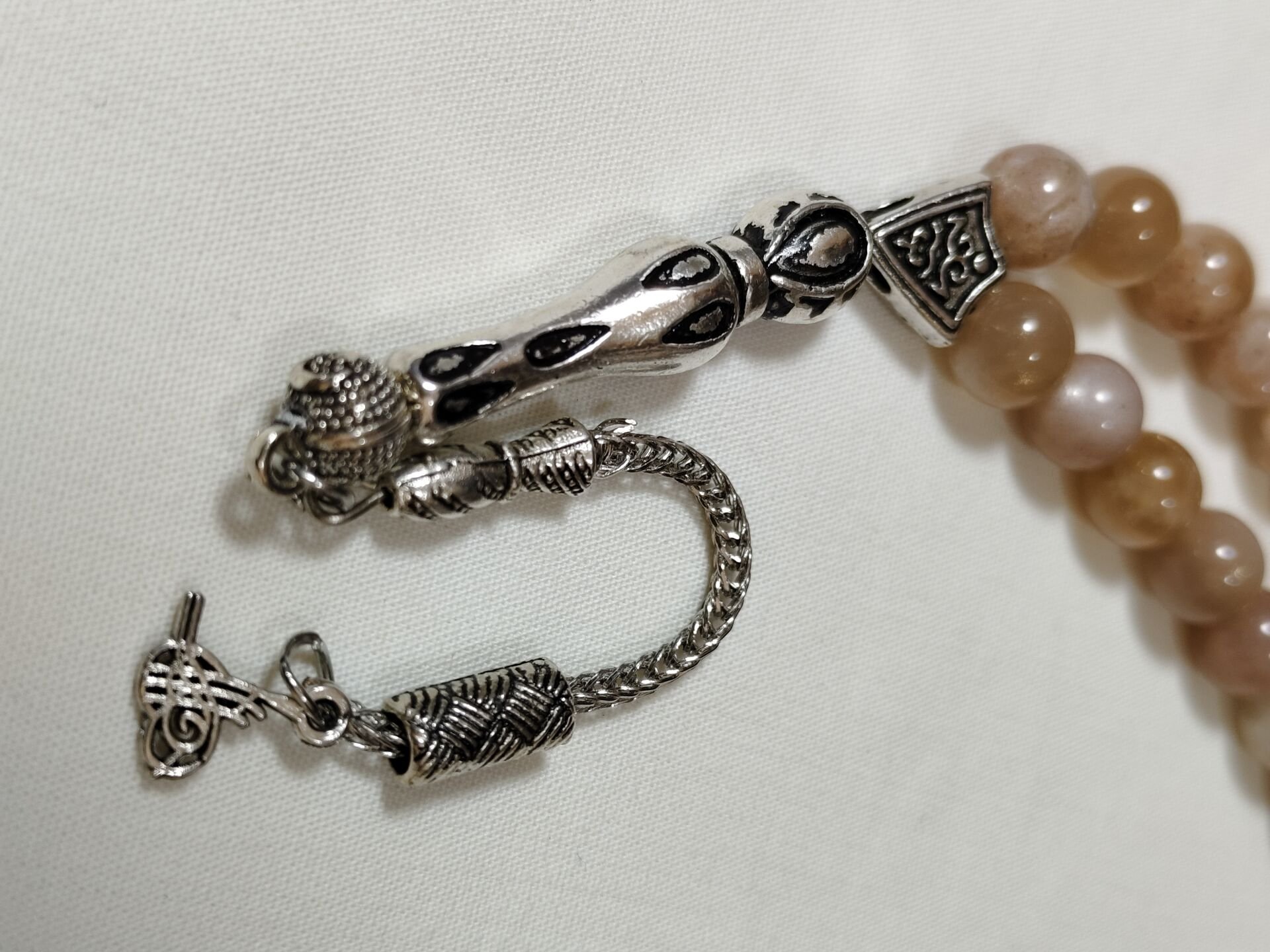 Bu tesbihte kullanılan doğal güneş taşları 8 mm boyutlarındadır. Diğer metal aparatlar zamak döküm gümüş kaplamadır. Zamanla gümüş gibi kararma yapabilir.