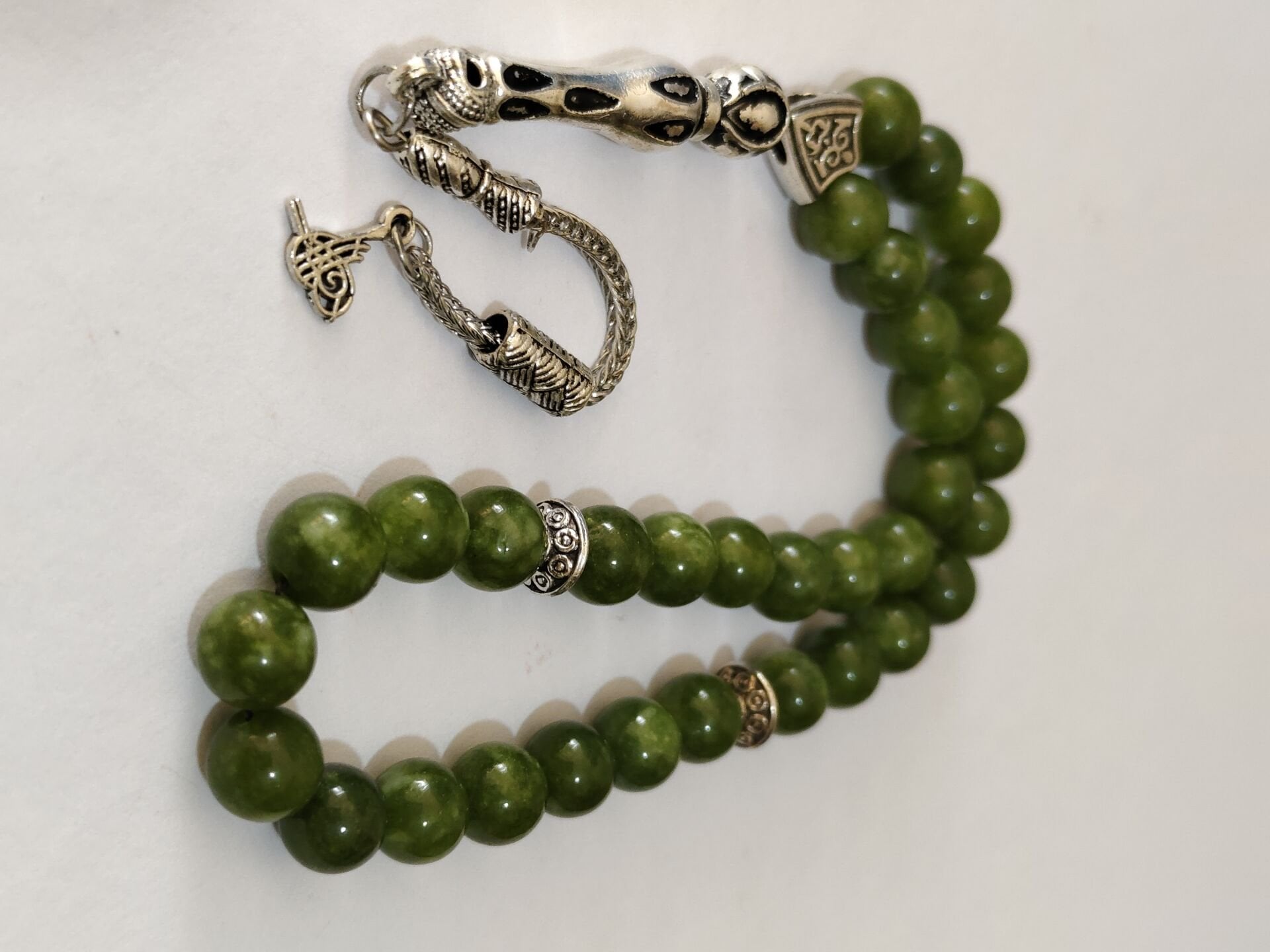 Bu tesbihte kullanılan doğal yeşim taşları 8 mm boyutlarındadır. Diğer metal aparatlar zamak döküm gümüş kaplamadır. Zamanla gümüş gibi kararma yapabilir.