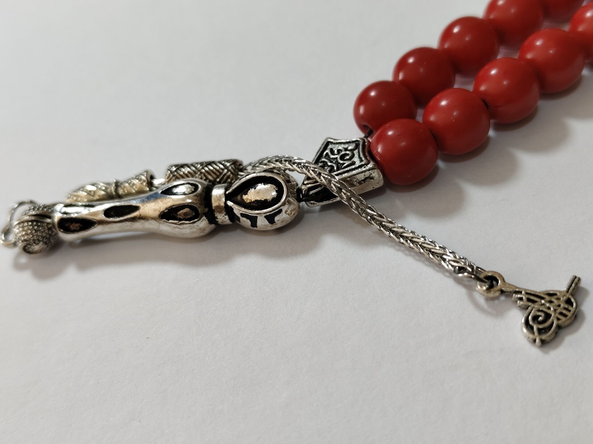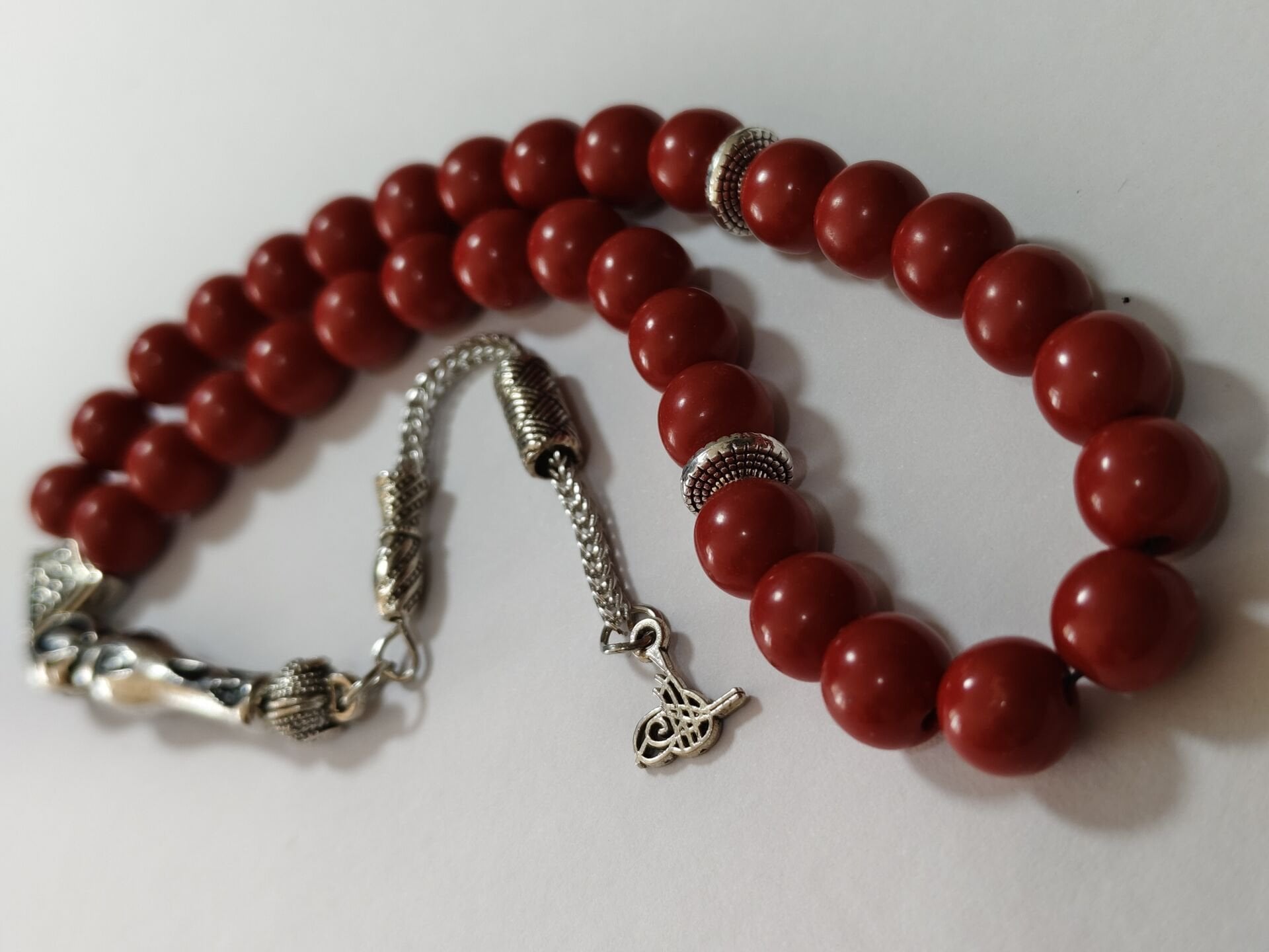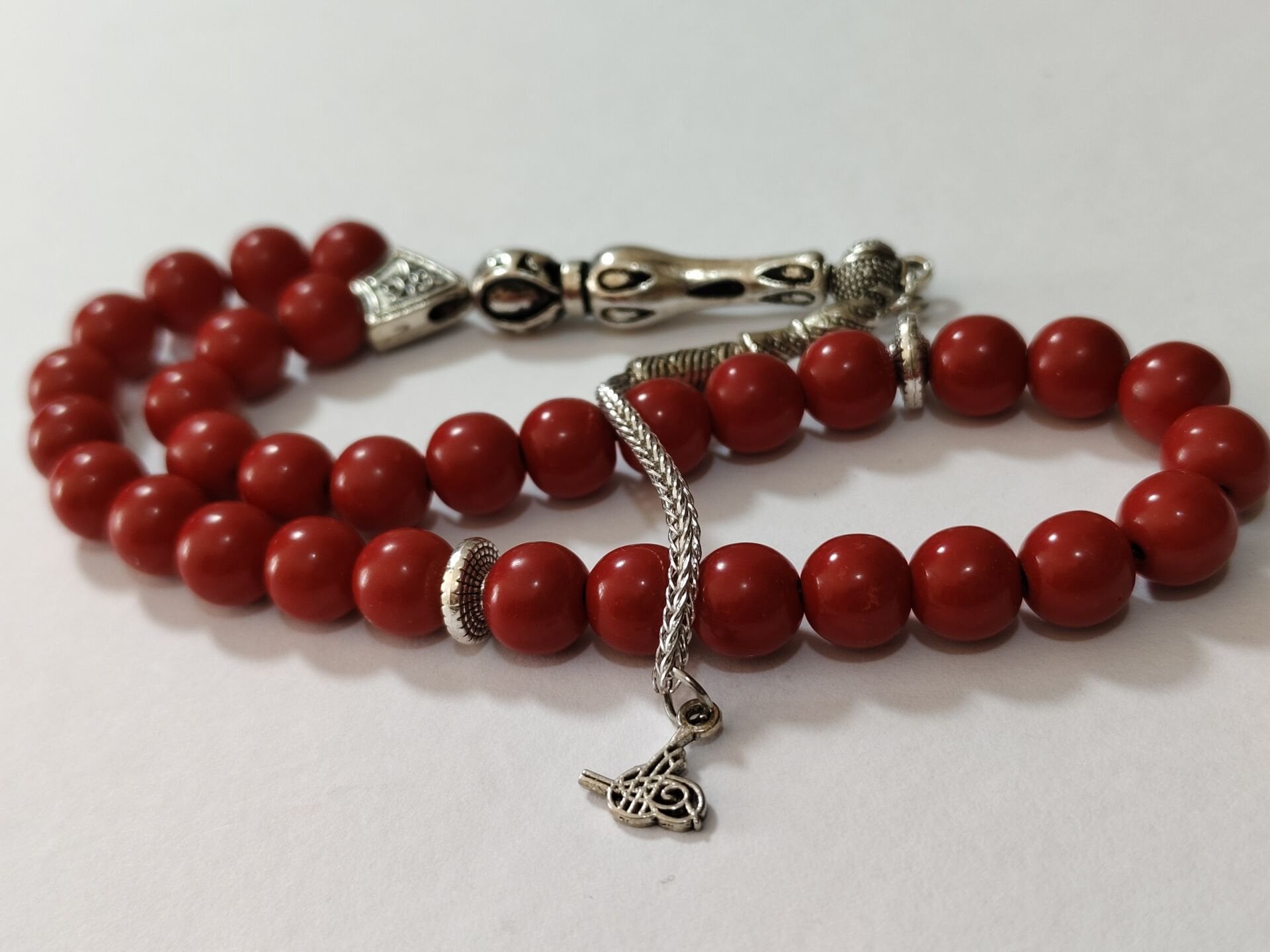 Bu tesbihte kullanılan doğal mercan taşları 8 mm boyutlarındadır. Diğer metal aparatlar zamak döküm gümüş kaplamadır. Zamanla gümüş gibi kararma yapabilir.