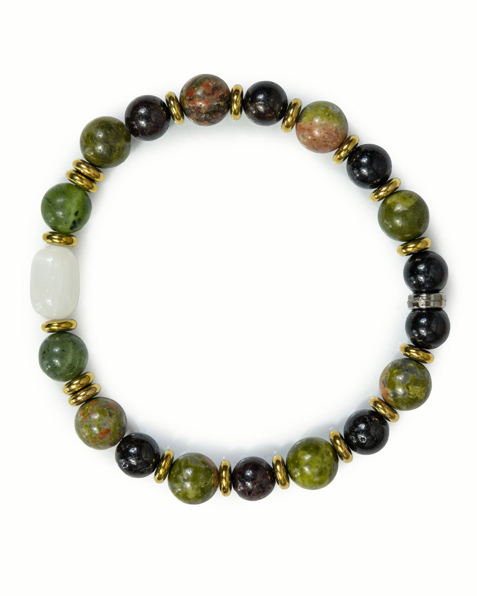 Bu özel doğal taş bileklik, Selenit, Unakit ve Turmalin taşlarının enerjilerini bir araya getirerek ruhsal denge ve pozitif titreşim sağlar.