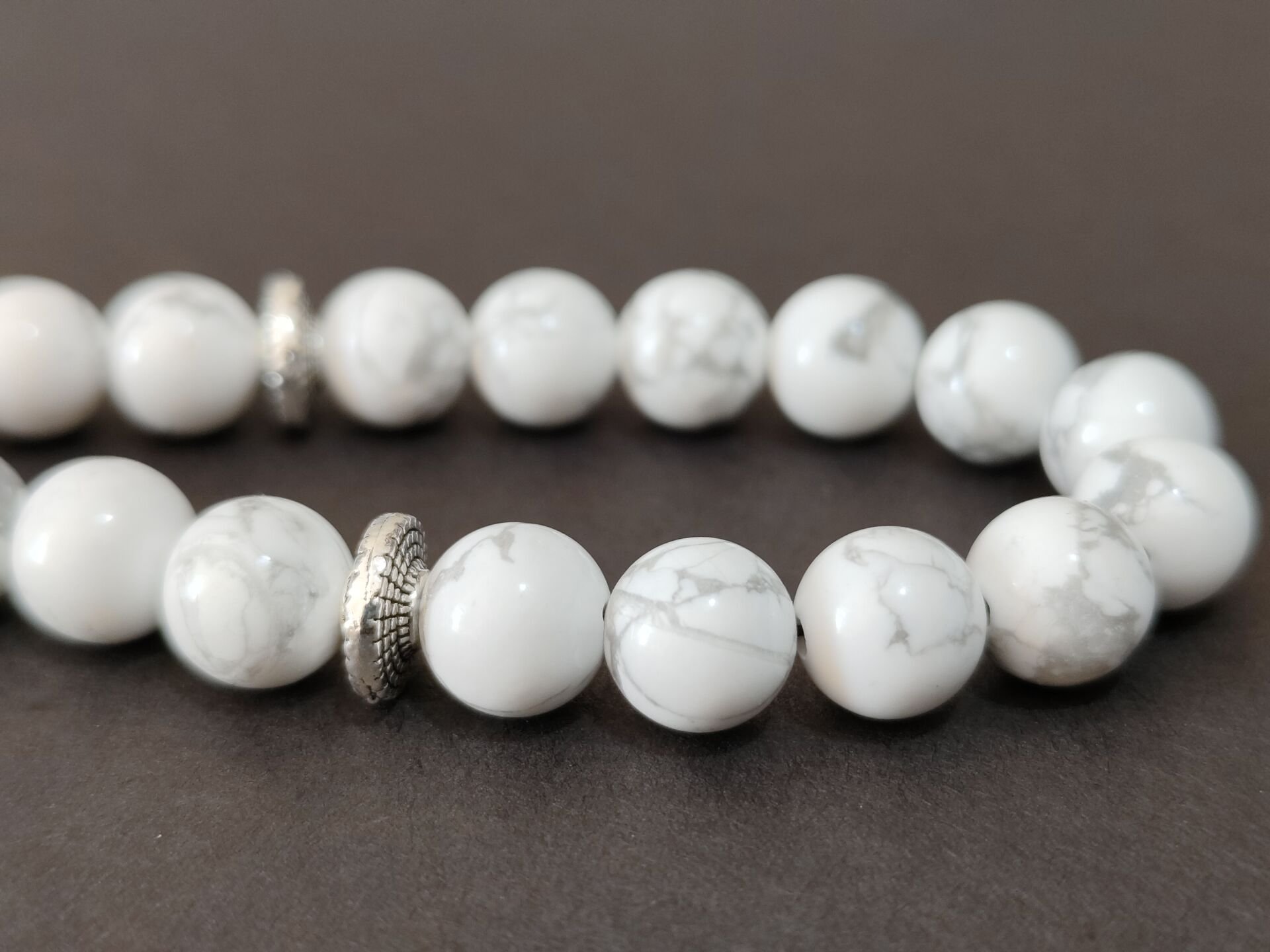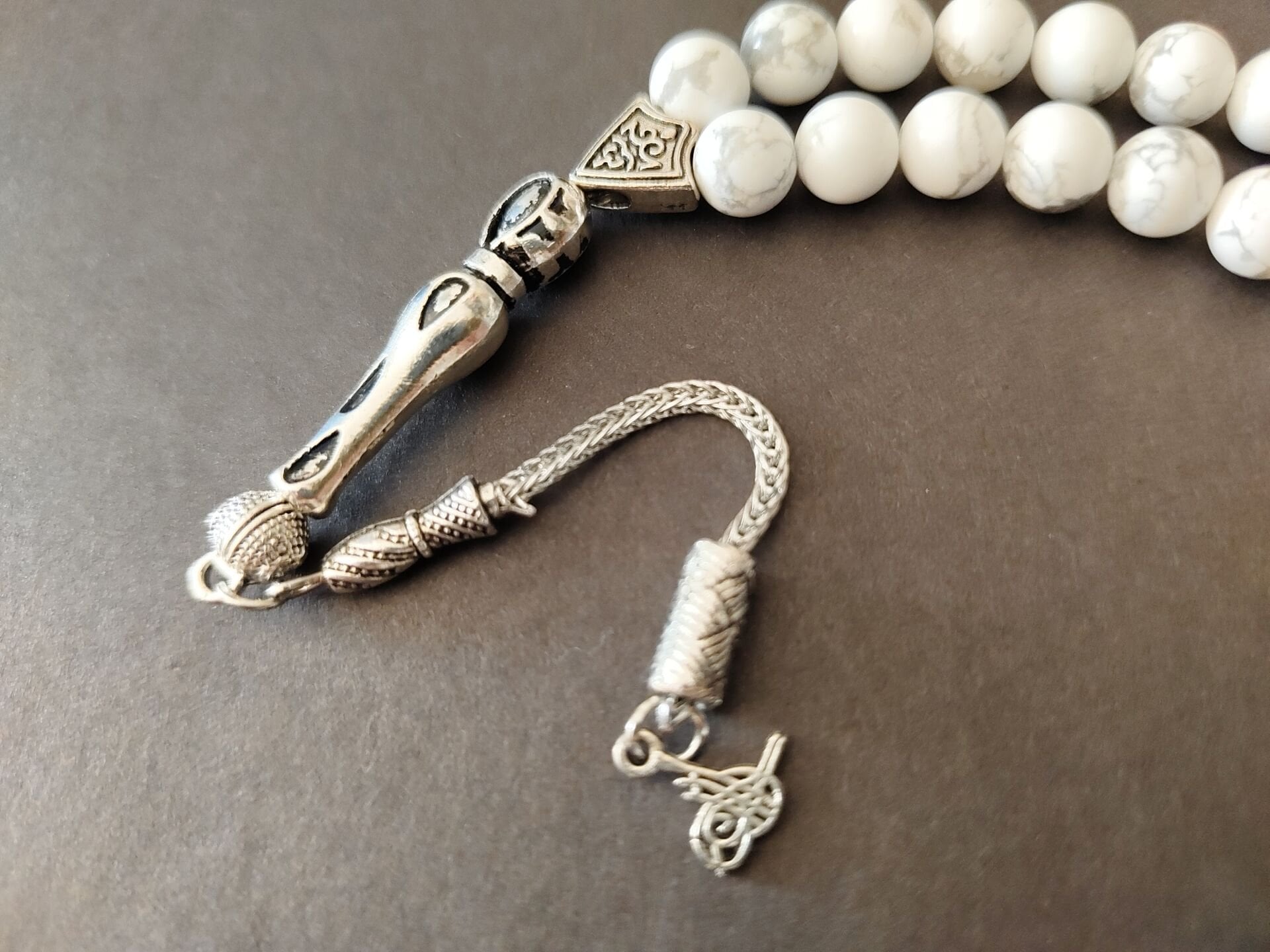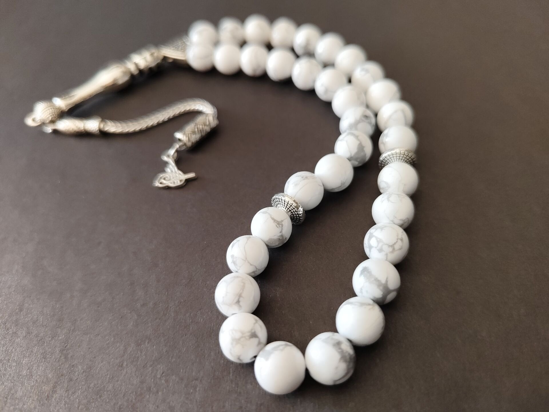 Bu tesbihte kullanılan doğal havlit taşları 8 mm boyutlarındadır. Diğer metal aparatlar zamak döküm gümüş kaplamadır. Zamanla gümüş gibi kararma yapabilir.