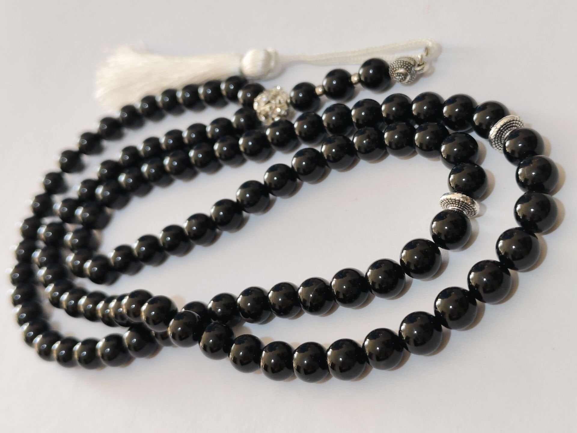 Bu tesbihte kullanılan doğal siyah akik taşları 8 mm boyutlarındadır.