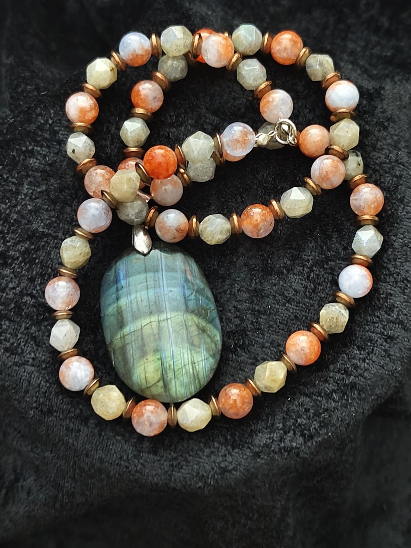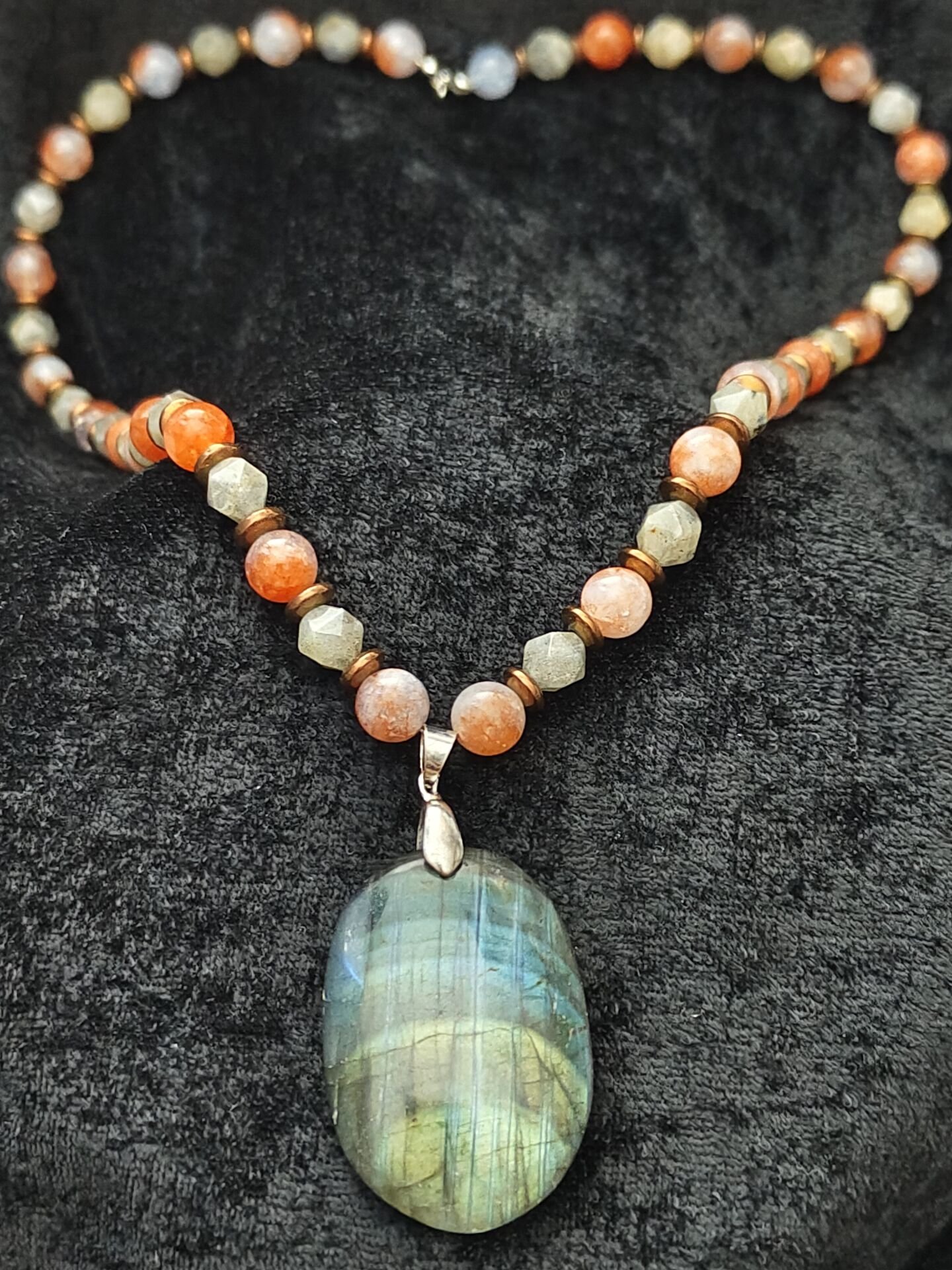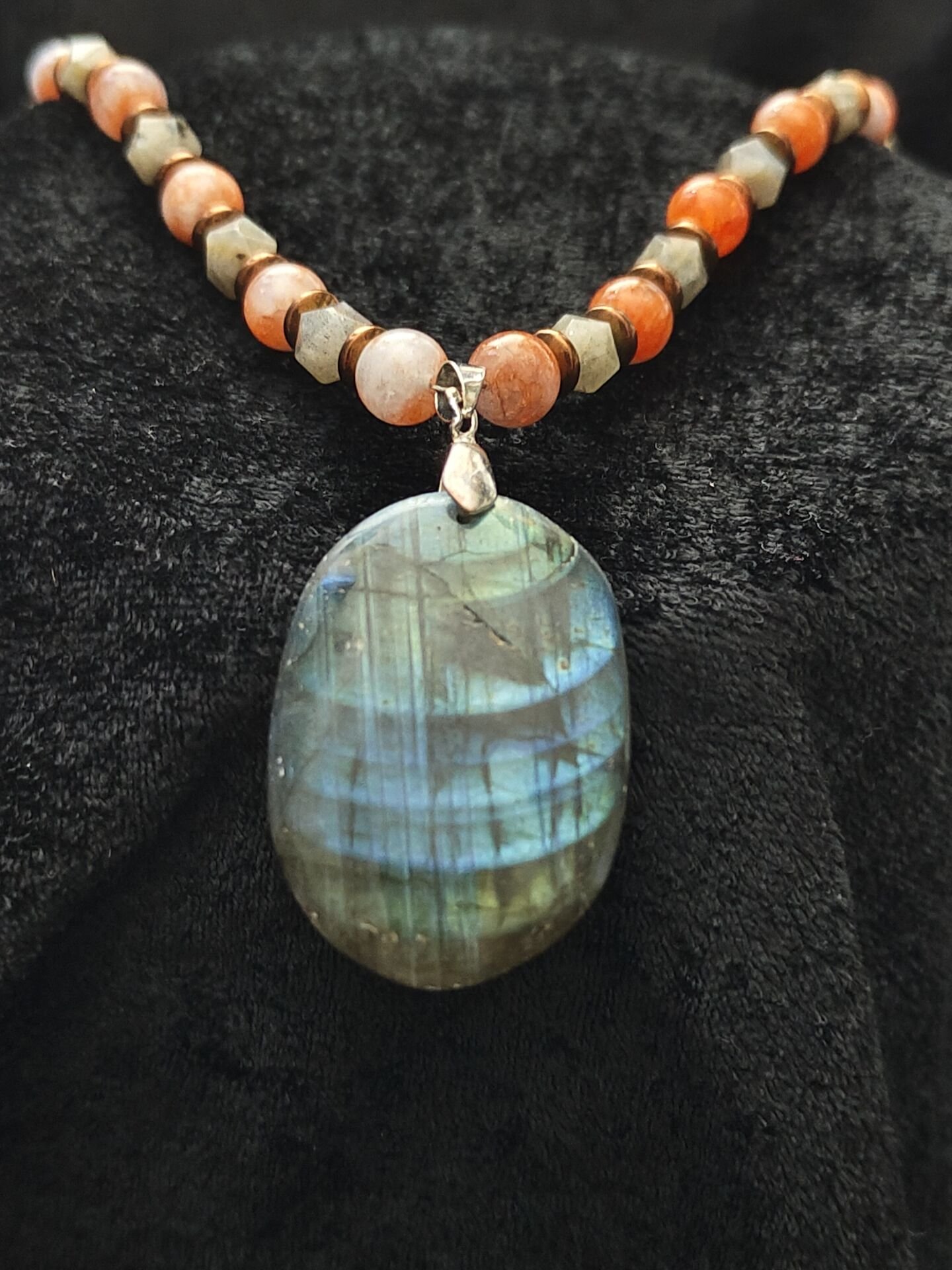 SÜPER YANSIMALI LABRADORİT TAŞI VE TURUNCU AKİK BAYAN KOLYE