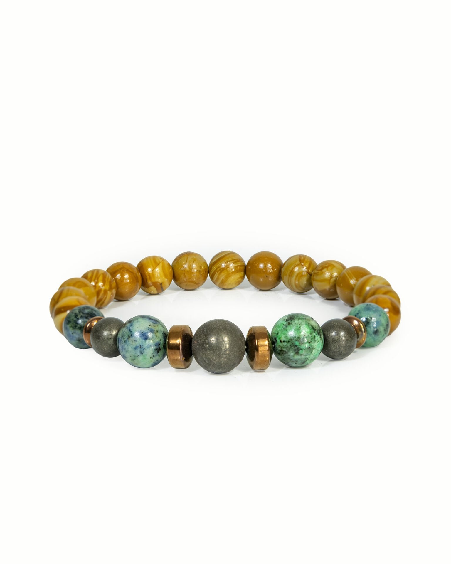 Zülkarneyn Setti Doğal Taş Bileklik – Azurit, Pirit ve Odun Jasper Zülkarneyn Setti doğal taş bileklik, güçlü enerjileriyle bilinen azurit, pirit ve odun jasper taşlarının bir araya gelmesiyle hazırlanmış, erkek ve bayan kullanıma uygun özel bir tasarımdır. Hem şık görünümü hem de doğal taşların kadim sembolik anlamları sayesinde günlük kullanımda ve özel anlarda tercih edilen anlamlı bir aksesuardır. Bu özel set, denge, güç ve farkındalık temalarını temsil ederken, doğal taş severler için estetik ve ruhsal uyumu bir arada sunar.